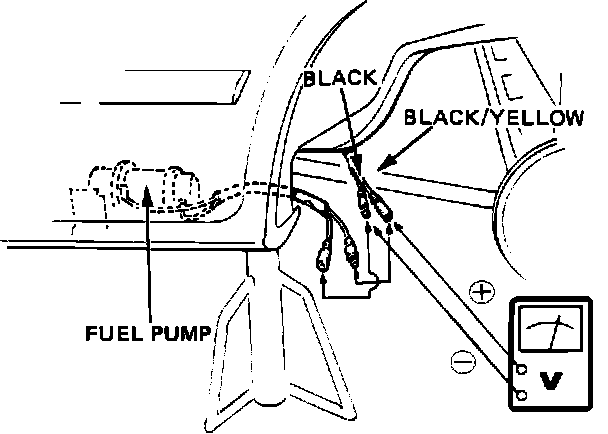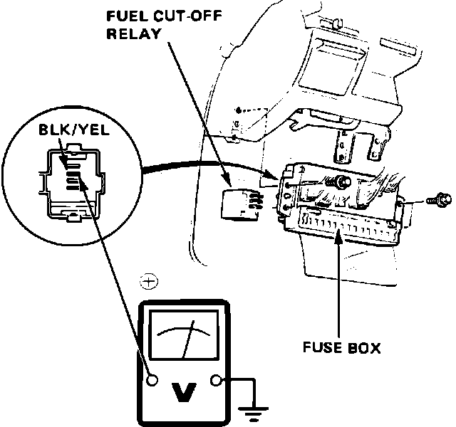2. Connect positive probe of voltmeter to the Black/Yellow wire at the fuel pump cut-off relay connector (from the ignition switch) and negative probe to ground. Turn the ignition on and check for battery voltage.
