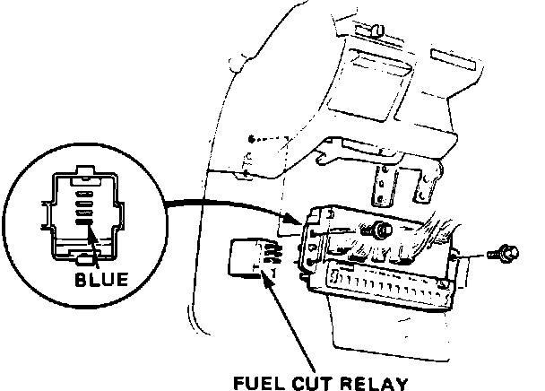 1. With ignition switch off, remove fuse box cover, fuse box/relay panel mounting bolt and nut, and pull down the fuse box/relay panel to expose the fuel pump cut-off relay. Remove the fuel pump cut-off relay.