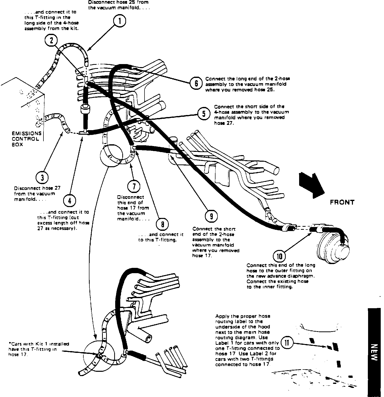 The large illustration shows what Kit 3 looks like installed on a car with running change 1 (a factory-installed version of Kit 1). If the car doesn't have running change 1 (check its engine number against the list for Kit 1), install Kit 1.*