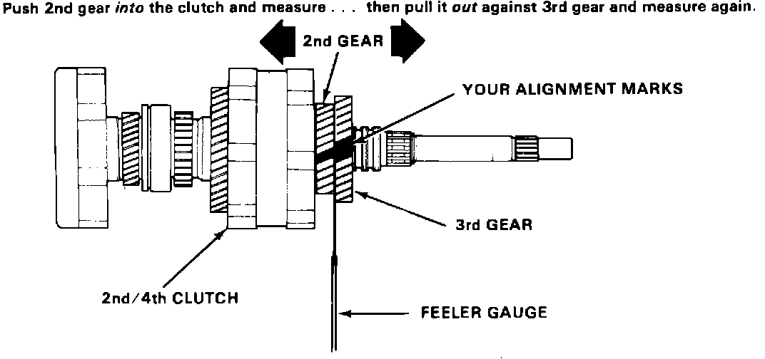 3. Push 2nd gear all the way into the clutch and line up the teeth you marked, then measure the clearance between 2nd gear and 3rd gear as shown. Write it down.