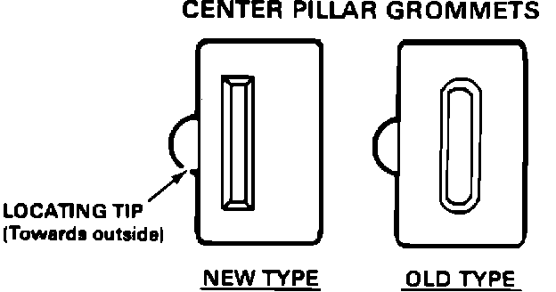 4. Replace the two center pillar grommets that hold the garnish screws in place with the new type listed under Parts Information. Install the grommets with the locating tip facing outward.