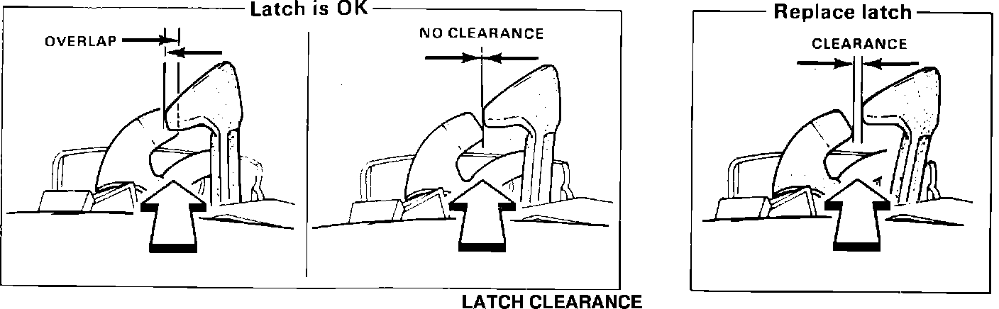 2. If the safety catch and latch have no clearance between them, or they overlap slightly, the latch is OK; go to step 4. If the safety catch and latch have any clearance at all between them, replace the latch with the updated part.