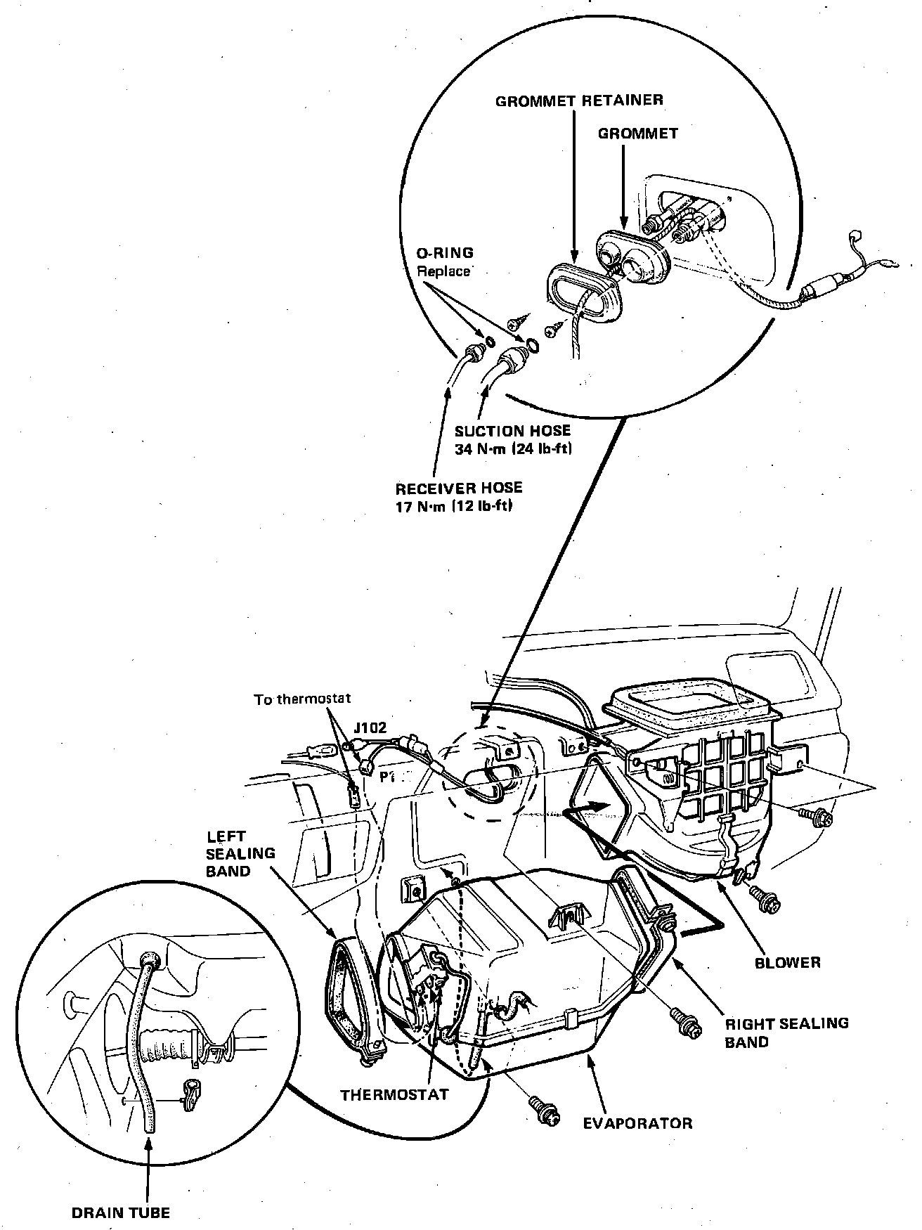 10. Remove evaporator core attaching bolts, then the evaporator core assembly.