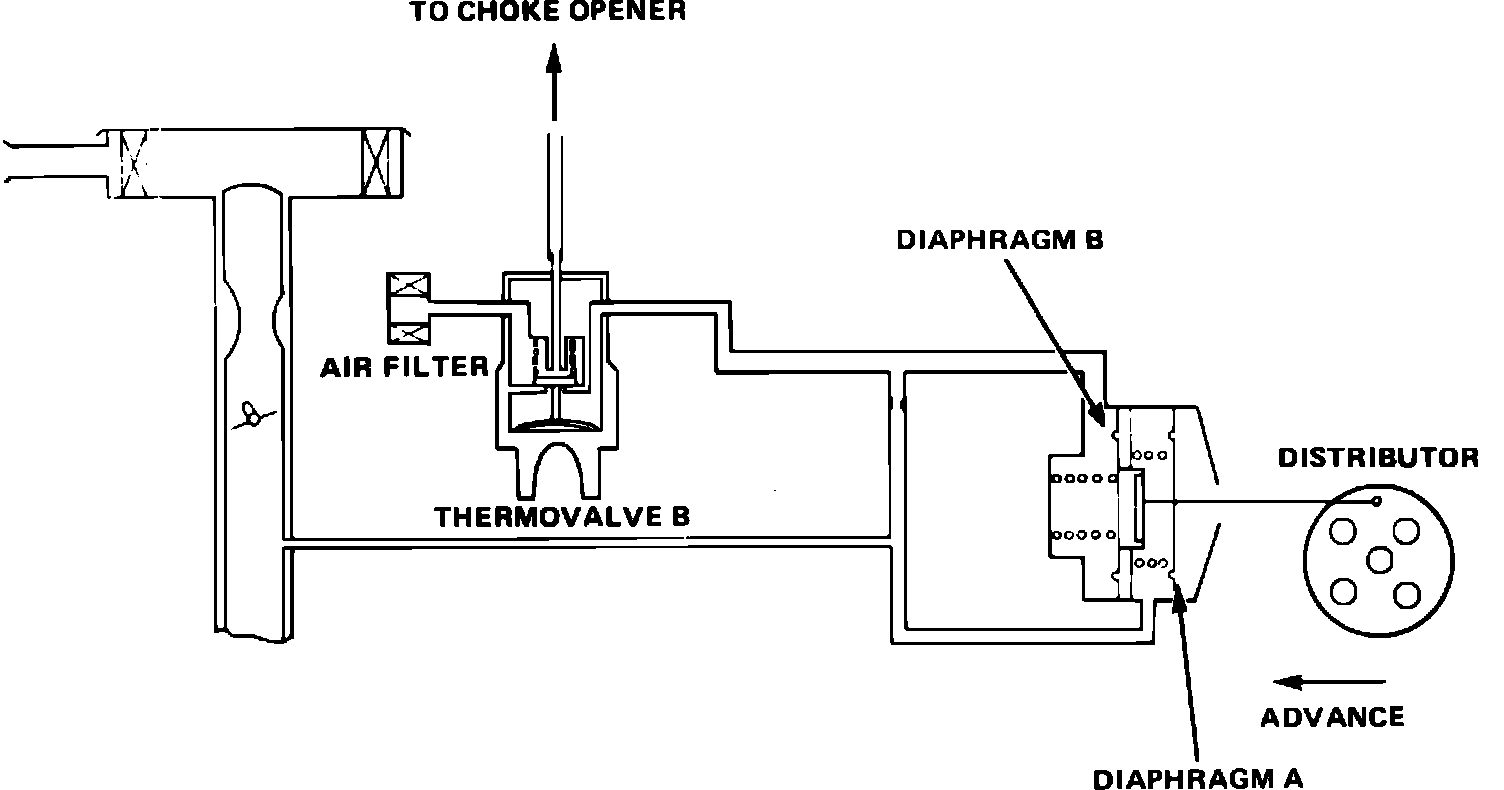 This system, Figs. 37, functions similarly to 1983 Prelude models. In addition the distributor has two separate vacuum advance diaphragms. Diaphragm A operates on manifold vacuum. Diaphragm B also operates on manifold vacuum but has a thermovalve in the line. When engine coolant temperature is below the specified temperature of the thermovalve, it sends vacuum to diaphragm B to improve cold engine performance.