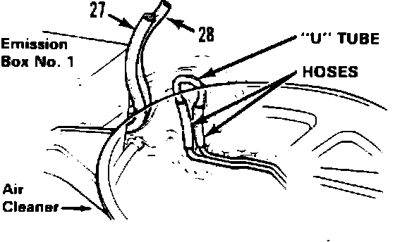 2. Remove hoses number 27 and 28 from the vacuum manifold at emission control box number 1. Fit a 1-1/2" length of vacuum hose on each end of the "U" tube, then fit the "U" tube and hoses on the vacuum manifold.