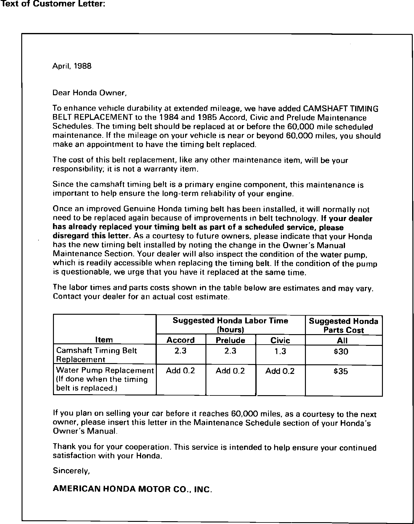 Owners of applicable 1984 and 1985 models will be notified of this Maintenance Schedule addition by mail. The letter will be sent on April 13, 1988. The text of the customer letter is shown on the reverse side of this service bulletin.