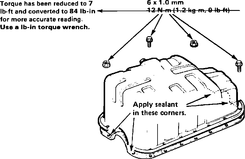 3. Torque the pan nuts and bolts to 84 lb. in., using a lb. in. torque wrench. Start at the middle of the pan and work your way to the ends in a criss-cross pattern.
