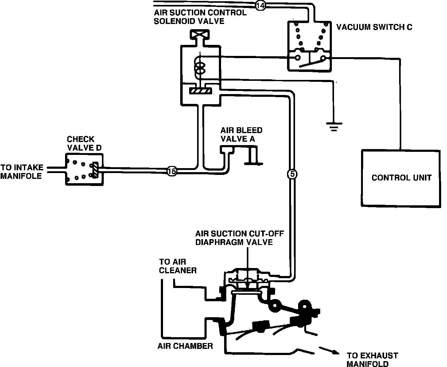 The air suction control solenoid valve is open by signals from the control unit when intake manifold vacuum is above the set value of vacuum switch C and manifold vacuum is applied to the air suction diaphragm valve to open the secondary air passage. Fresh air enters into the exhaust manifold, when negative pressure makes the air suction reed valve open.