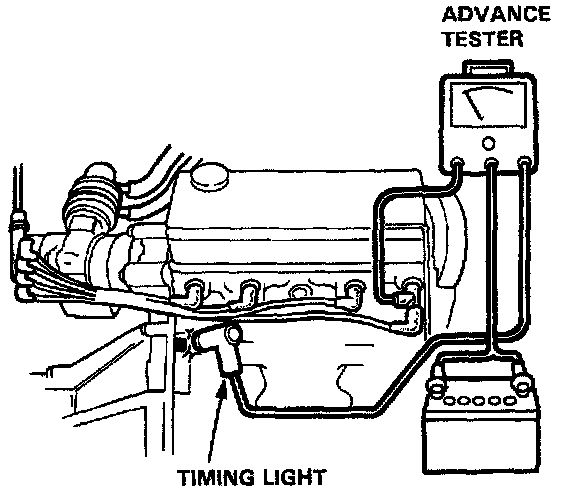 4. Reconnect the hoses to the vacuum advance diaphragm, then connect an advance tester to the engine. While the engine idles, point a timing light toward the flywheel (for M/T), or the drive plate (for A/T).