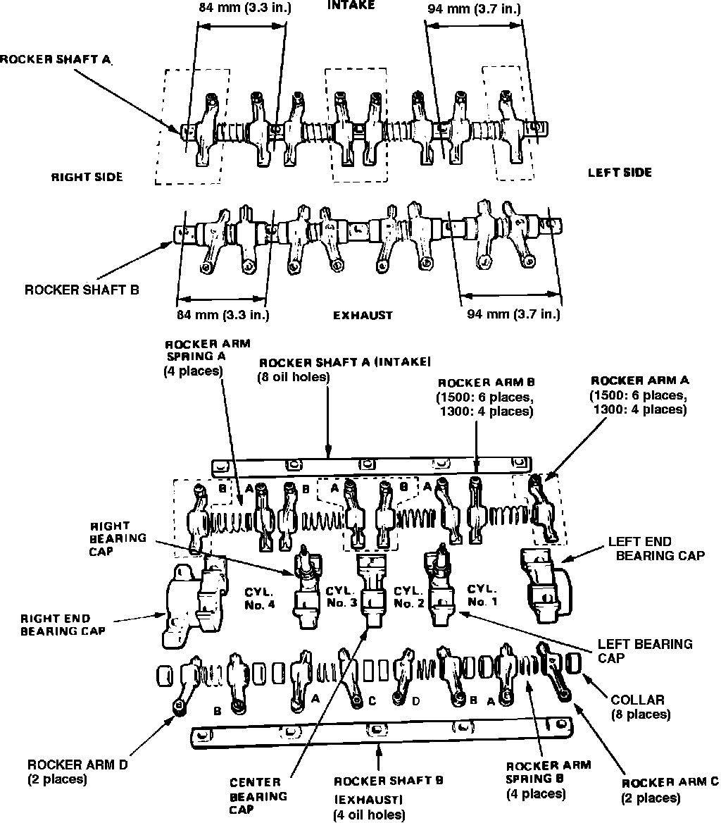 Fig. 13 Rocker arm assembly exploded view. 1984-87 Civic & CRX w/standard carbureted engine (HF engine similar):