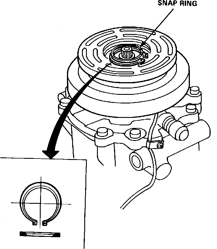 7. Remove field coil snap ring from groove, then the field coil from compressor.