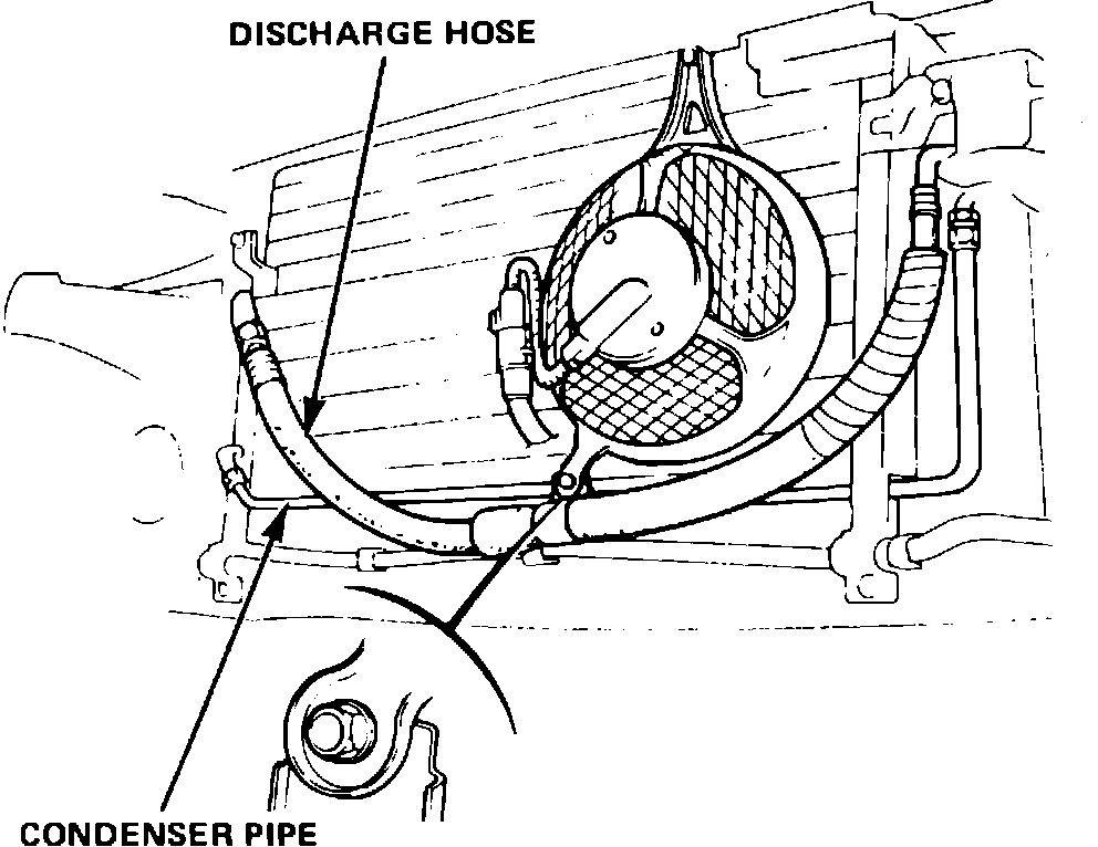 6. Remove condenser attaching bolts, then condenser. It may be necessary to remove condenser fan shroud to gain access for condenser removal.