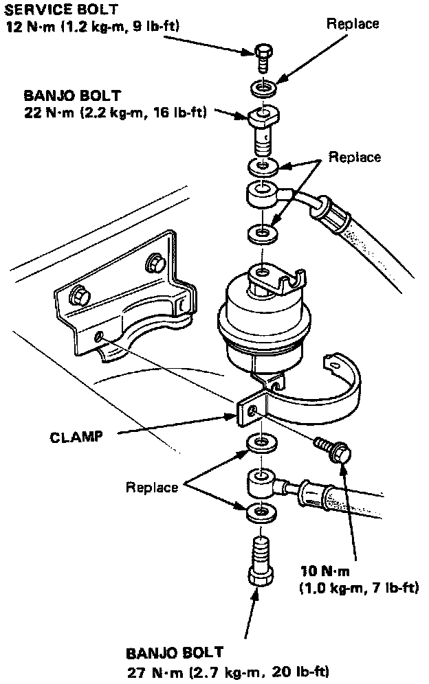 NOTE: The filter should be replaced: every 60,000 miles (96,000 km), or whenever the fuel pressure drops below the specified value (255 ± 20 kPa, 2.55 ± 0.2 kg/cm2, 36 ± 3 psi with the vacuum pressure hose disconnected) after making sure that the fuel pump and the pressure regulator are OK.