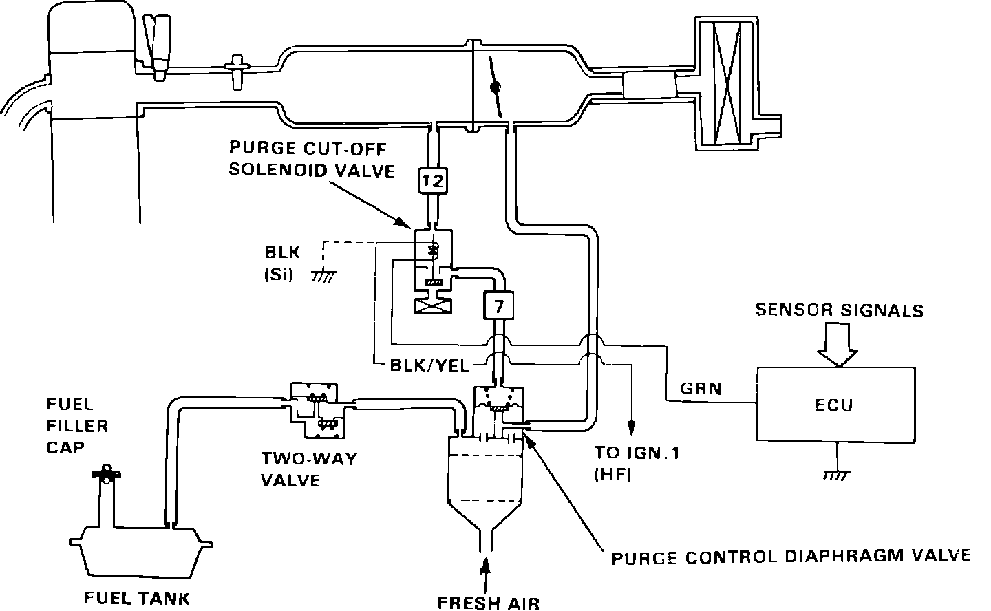When the purge cut-off solenoid valve is open, intake manifold vacuum opens the purge control diaphragm valve in the canister. When the purge cut solenoid valve is ON, the valve is closed and purge cut is performed. Fuel vapors stored in the canister are purged to the throttle body primary bore by the vacuum generated at the purge port.