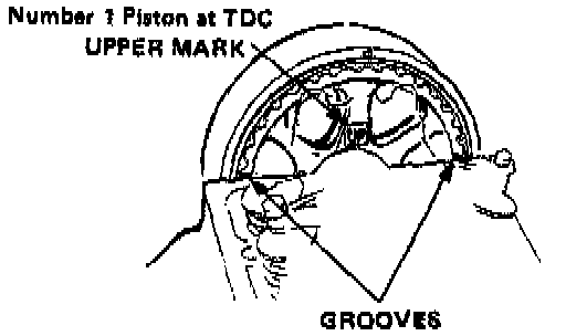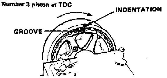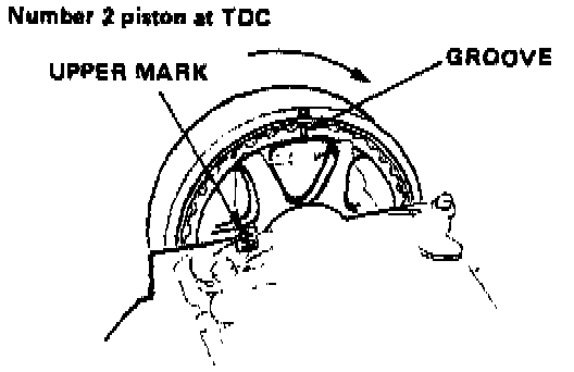 6. Rotate crankshaft 180° counterclockwise (cam pulley turns 90°). TDC groove should be aligned with the indentation in the belt cover. "UP" mark should not be visible. Distributor rotor should point to No. 3 plug wire. Adjust valves on No. 3 cylinder.