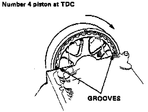7. Rotate crankshaft 180° counterclockwise to bring No. 4 piston to TDC. Both TDC grooves are once again visible and distributor rotor points to No. 4 plug wire. Adjust valves on No. 4 cylinder.