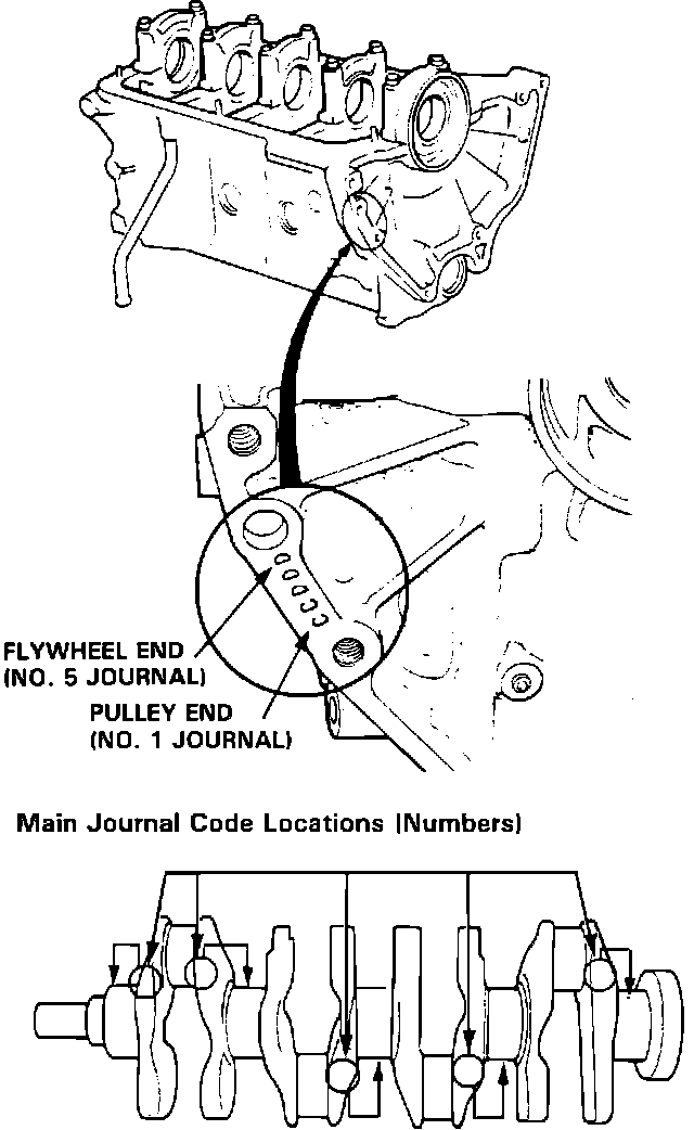 Different sizes of main bearings may be present in the same engine. To find the correct bearing size for each journal, use the provided chart to properly reference the code markings on block and crankshaft.