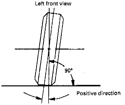 Camber is the inward or outward tilting of the front wheels from the vertical. When the wheels tilt outward at the top, the camber is positive (+). When the wheels tilt inward at the top, the camber is negative (-). The amount of tilt measured in degrees from the vertical is called the camber angle. If camber is extreme or unequal between the wheels, improper steering and excessive tire wear will result. Negative camber causes wear on the inside of the tire, while positive camber causes wear to the outside.