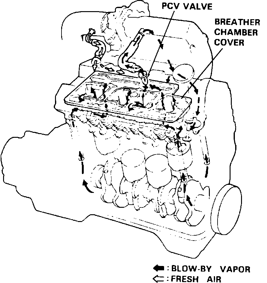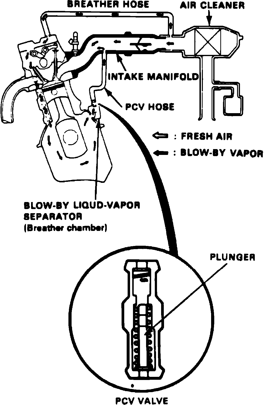 Blow-by gasses are evacuated from the engine through a liquid/vapor separator mounted on the crankcase, Figs. 11 through 13. Manifold vacuum is applied to the liquid/vapor separator through a PCV valve. Ventilating air is drawn into the engine through a blow-by filter on the valve cover on Accord or through a tube to the main air cleaner on Civic, CRX and Prelude. The air is drawn down into the crankcase through the oil return passages by manifold vacuum, where it mixes with the blow-by gasses, and the blow-by gasses are drawn into the intake stream and burned during the normal combustion process. On some models, a heater hose containing engine coolant is built around the PCV valve to prevent it from icing during cold weather.