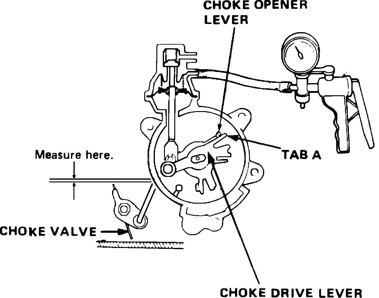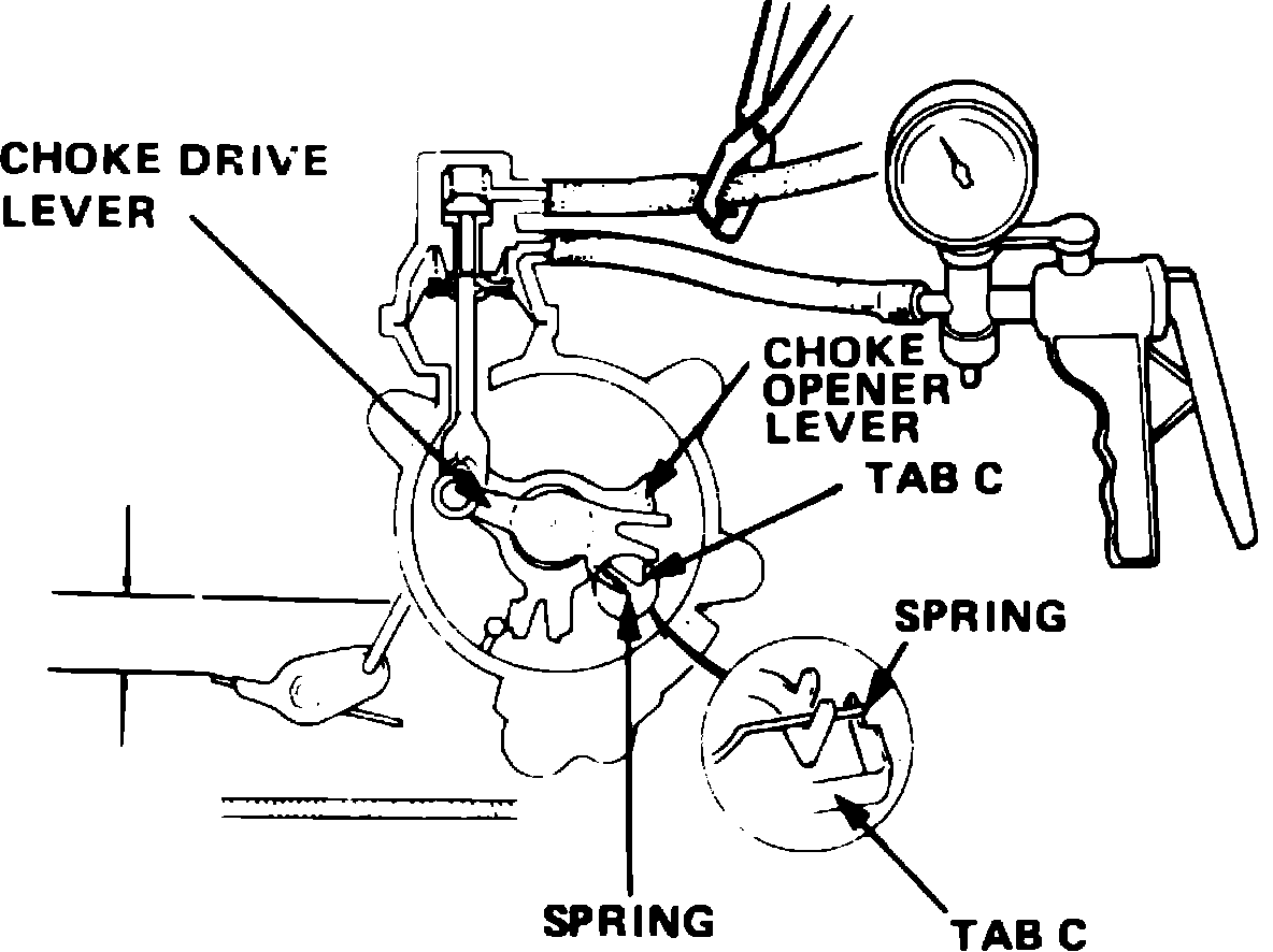 8. Continue holding opener lever against tab, rotate choke drive lever until tab C contacts spring, then measure choke clearance, Fig. 11.