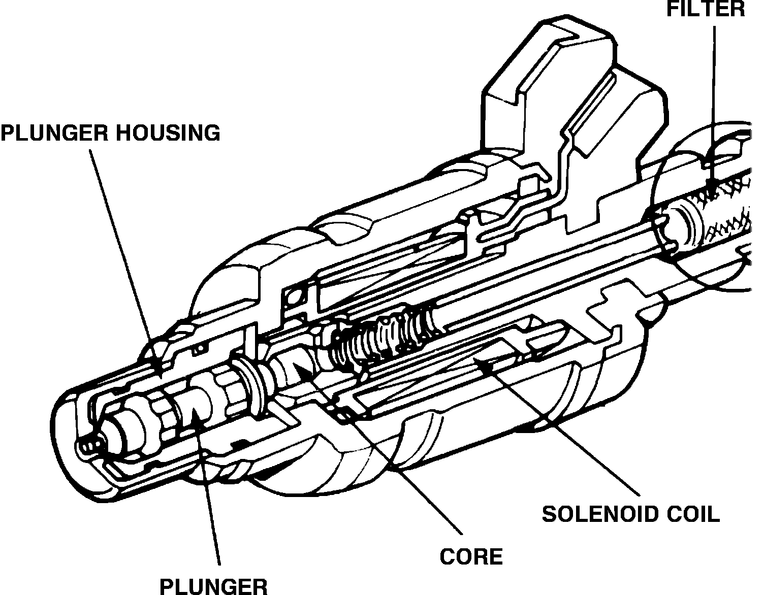 The injector is of the solenoid-actuated constant-stroke pintle type. The injector consists of a solenoid, plunger, needle valve and housing, Fig. 19. When current is applied to the solenoid coil, the valve lifts up and pressurized fuel fills the injector. Because needle valve lift and fuel pressure are constant, the injection quantity is determined by the length of time the valve is open. The injector is sealed around by an O-ring and seal ring at the top and bottom. These seals also reduce operating noise.