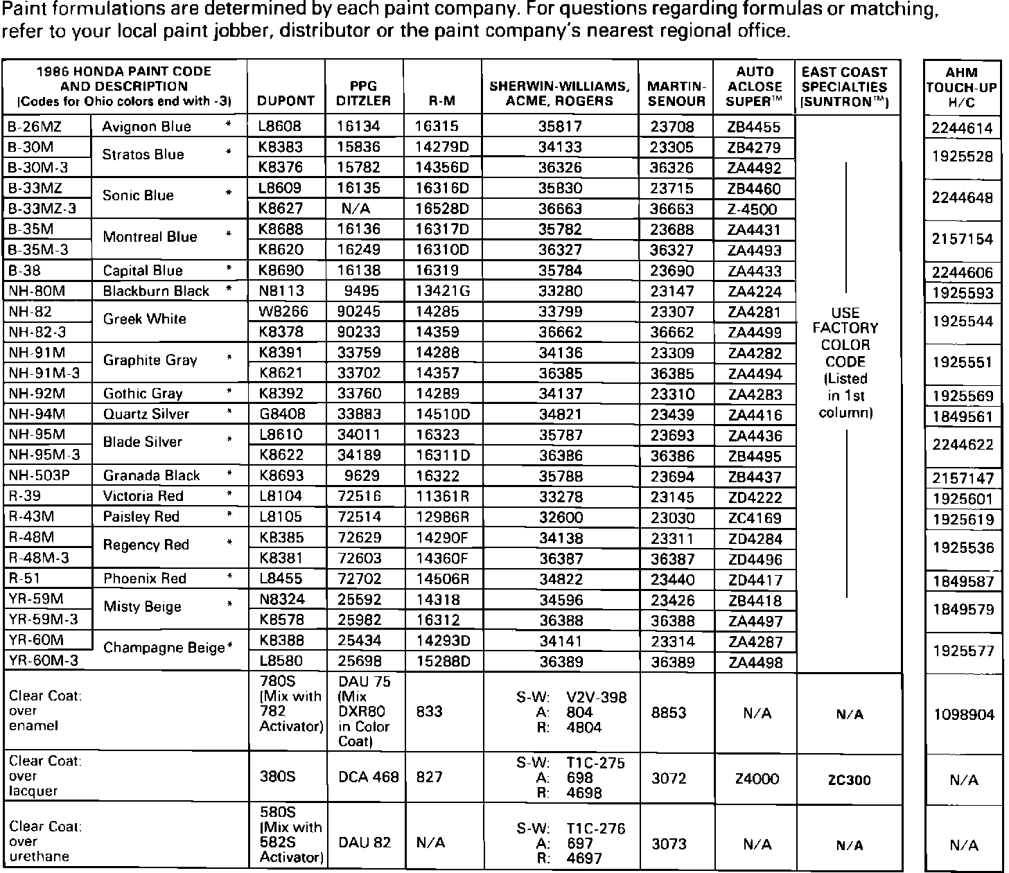 ^ Metallic colors have Honda paint code numbers ending in "M."