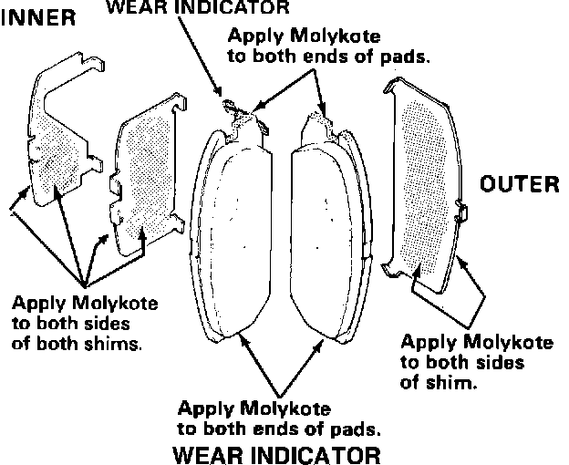 4.. Apply Molykote M77 to both sides of the outer pad shim and to the pad/caliper contact surfaces.