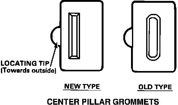 4. Replace the two center pillar grommets that hold the garnish screws in place with the new type listed under Parts Information. Install the grommets with the locating tip facing outward.