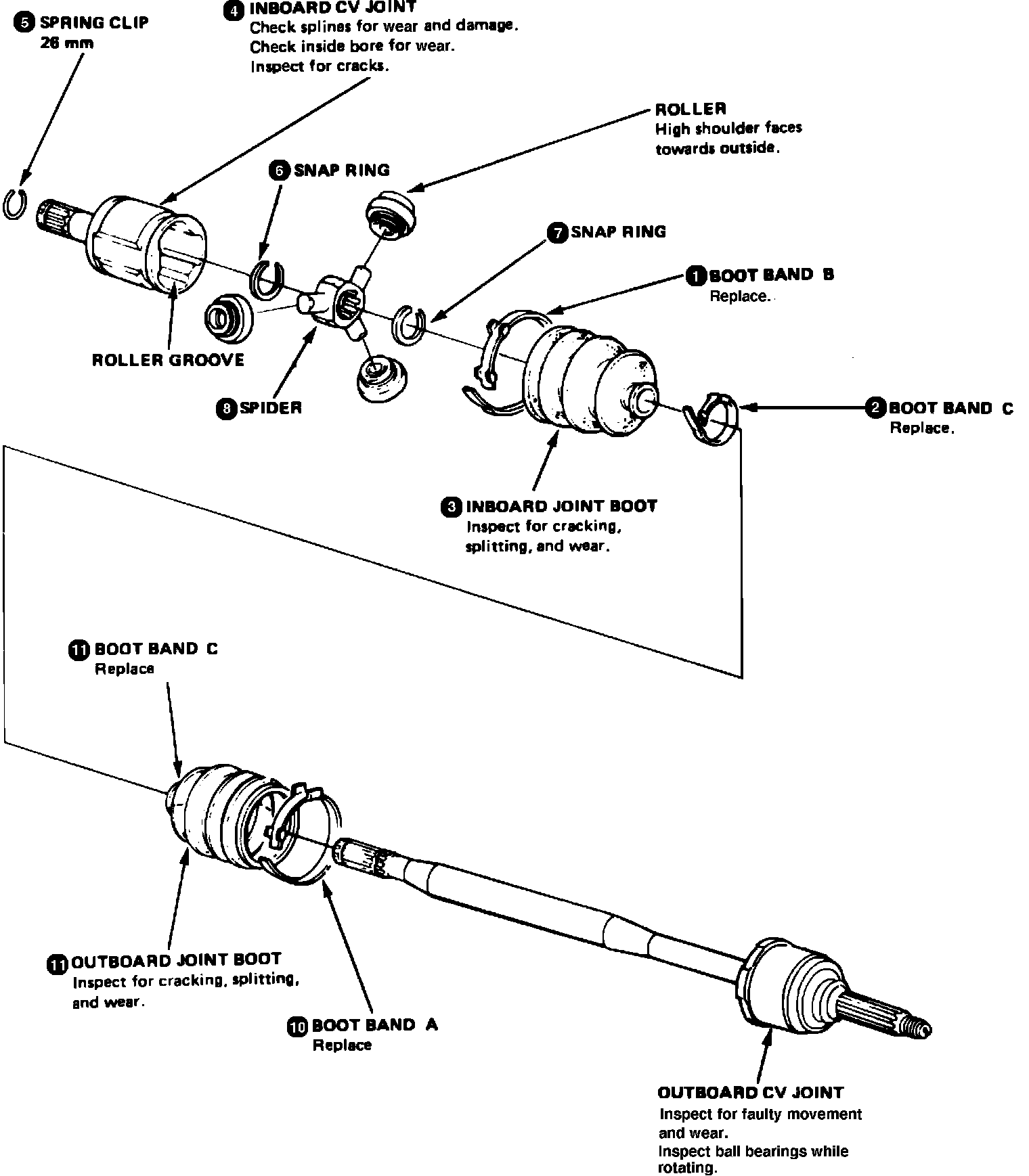 1. To disassemble driveshafts, follow numbered sequence shown in Fig. 2. Prior to disassembly, mark rollers and grooves to ensure proper component installation during assembly.