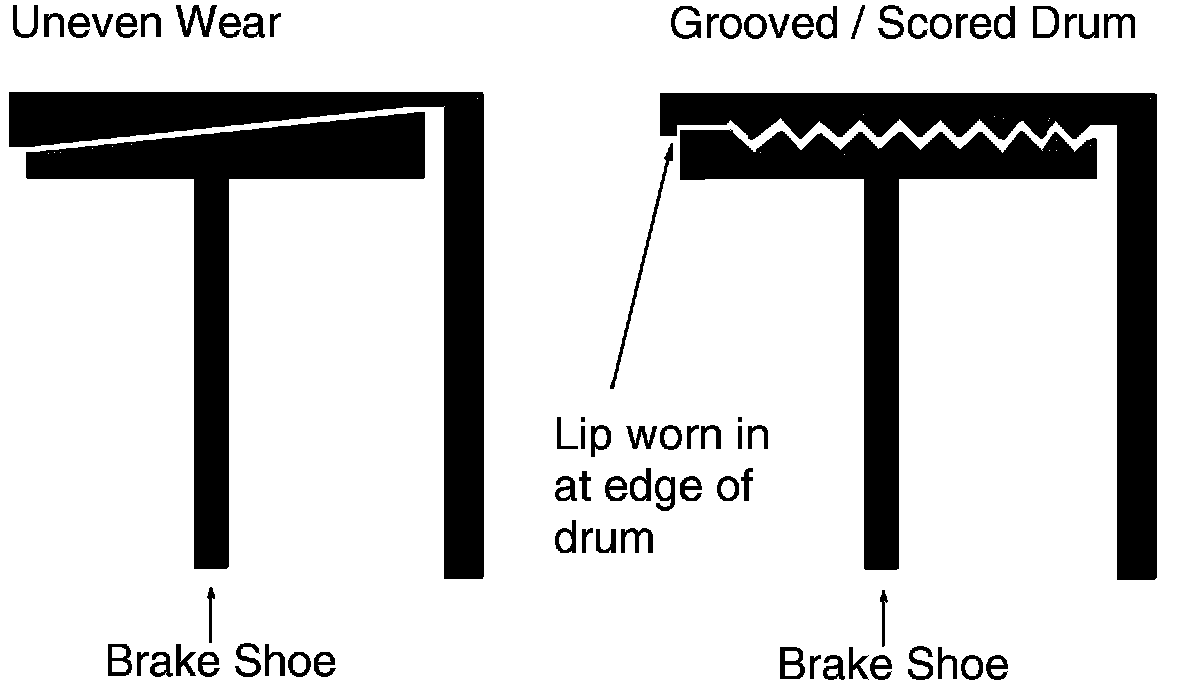Uneven Wear - Uneven wear across the surface of the shoe creates a wedge which prevents the drum from sliding off.
