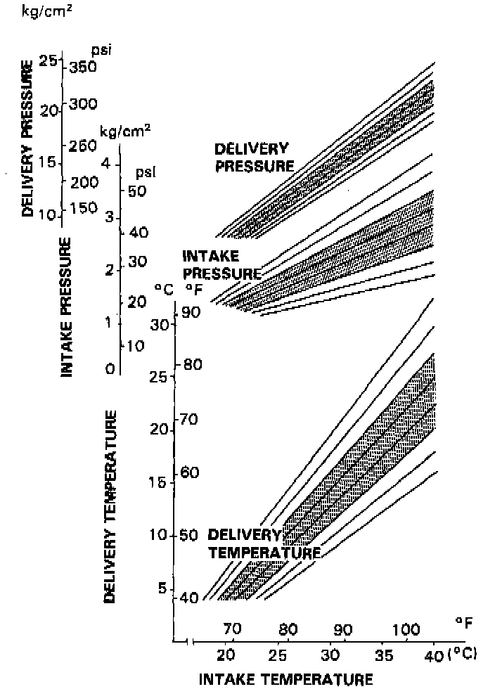 - Find your intake temperature across the bottom, and the relative intake and delivery pressures up the side.