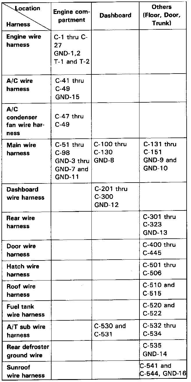 Identifying numbers have been assigned to all connectors. The number is preceded by the letter "C" for connectors, "GND" for ground terminals or "T" for non-ground terminals. Refer to image for location of connectors and harnesses.