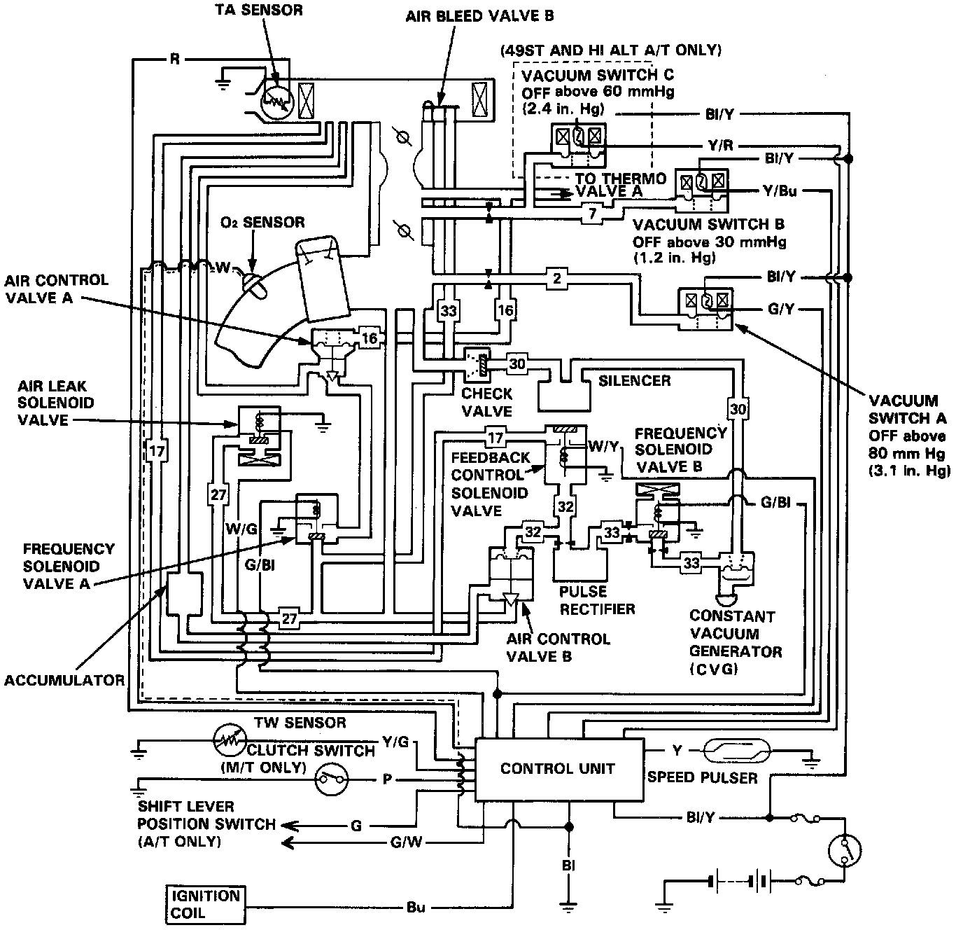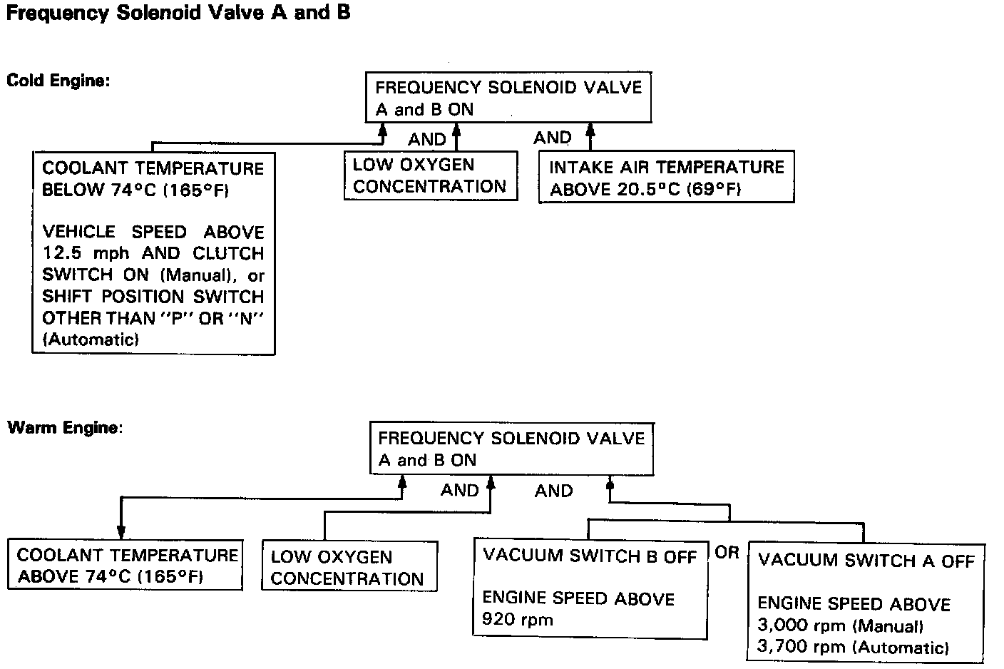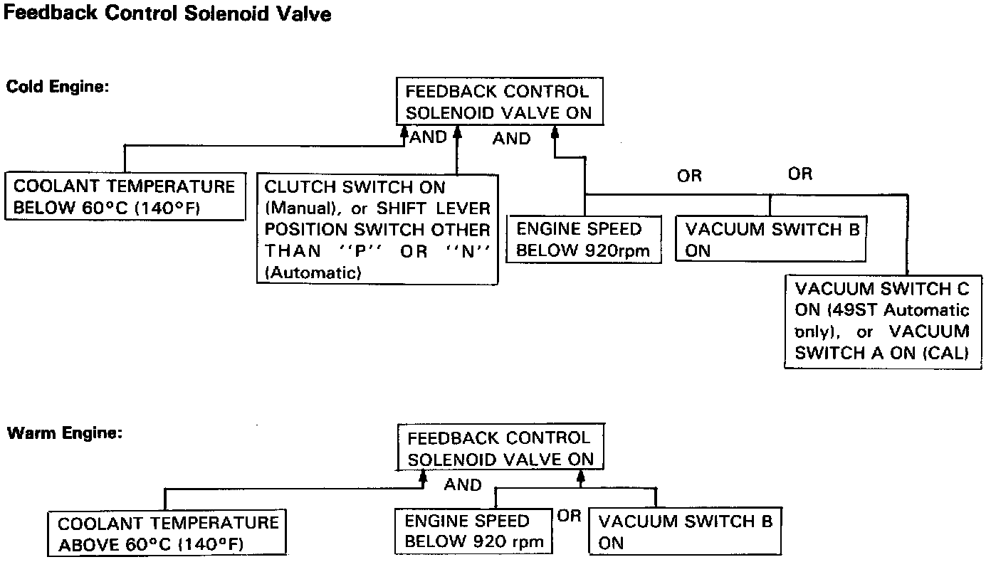 The feedback control solenoid valve is provided to stop feedback operation at low engine speed such as idling. Frequency solenoid valve B gets signals through the [1][2]control unit from the oxygen sensor installed in the exhaust manifold. Air control valve B is opened only when the oxygen content is less than stoichiometric (rich air-fuel ratio).