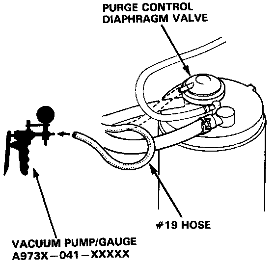 HOT ENGINE1. Disconnect the # 19 vacuum hose at the purge control diaphragm valve and connect a vacuum pump/gauge to the hose.