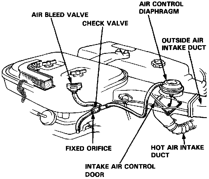 NOTE: As the outside air temperature drops, the bimetal spring in the bleed valve closes, causing the air control door to rise and allowing pre-heated air into the air cleaner; consistent intake air temperature (approximately 100°F) is maintained in this way.