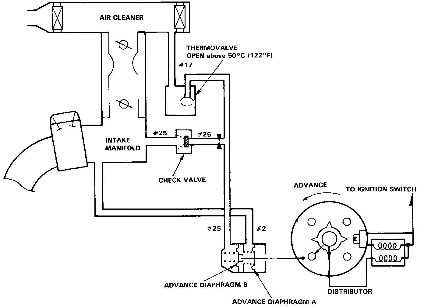 This system is provided to improve driveability at cold engine temperature by advancing the ignition timing. When the engine coolant temperature is below the set temperature of the thermovalve, manifold vacuum is applied through the check valve to the diaphragm of the vacuum advance unit. The thermovalve blocks the air entering the vacuum line and the diaphragms retract to turn the breaker plate of the distributor to advance the timing. When the coolant temperature is above the set value, vacuum in the thermovalve is released.