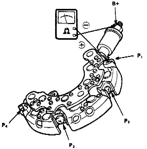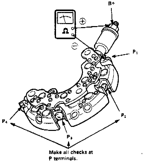 ^ Connect POSITIVE test probe to B+ terminal and NEGATIVE test probe to P terminal of each diode pair. Note readings.