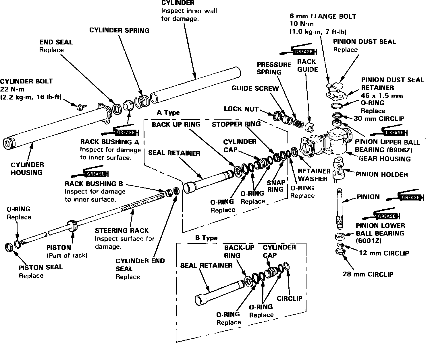 7. Coat sliding surface of rack bushing B with grease, then install bushing on rack with grooved side facing rack piston.