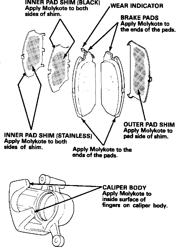 Apply Molykote M77 thinly and evenly as shown; make sure it doesn't contaminate the friction material.