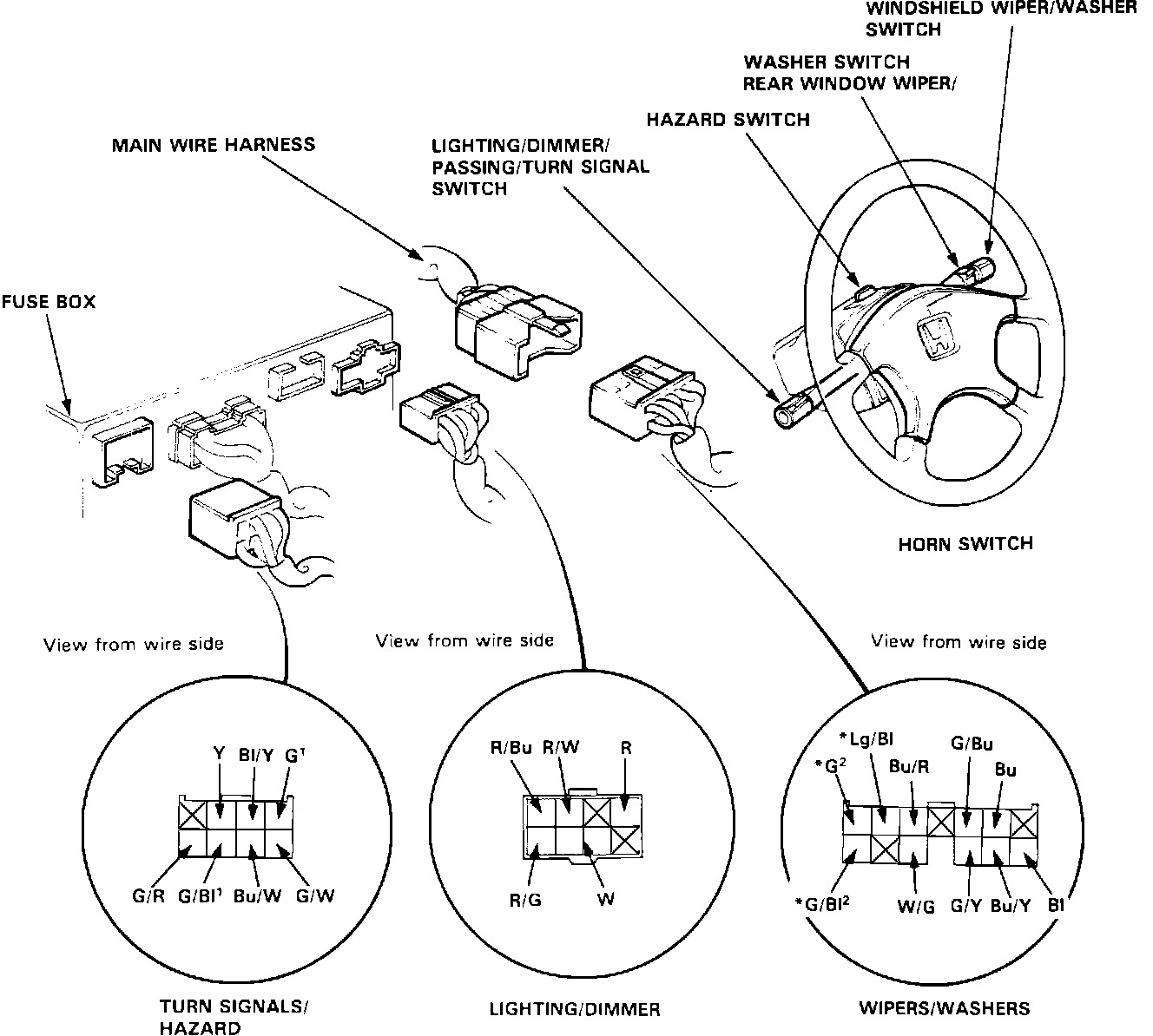 1. Disconnect wiper, turn signal, and lighting switch connectors from behind the fuse panel.