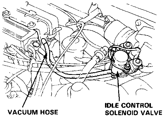 3. Disconnect the upper vacuum hose of the idle control solenoid valve (between the valve and intake manifold) from the intake manifold.