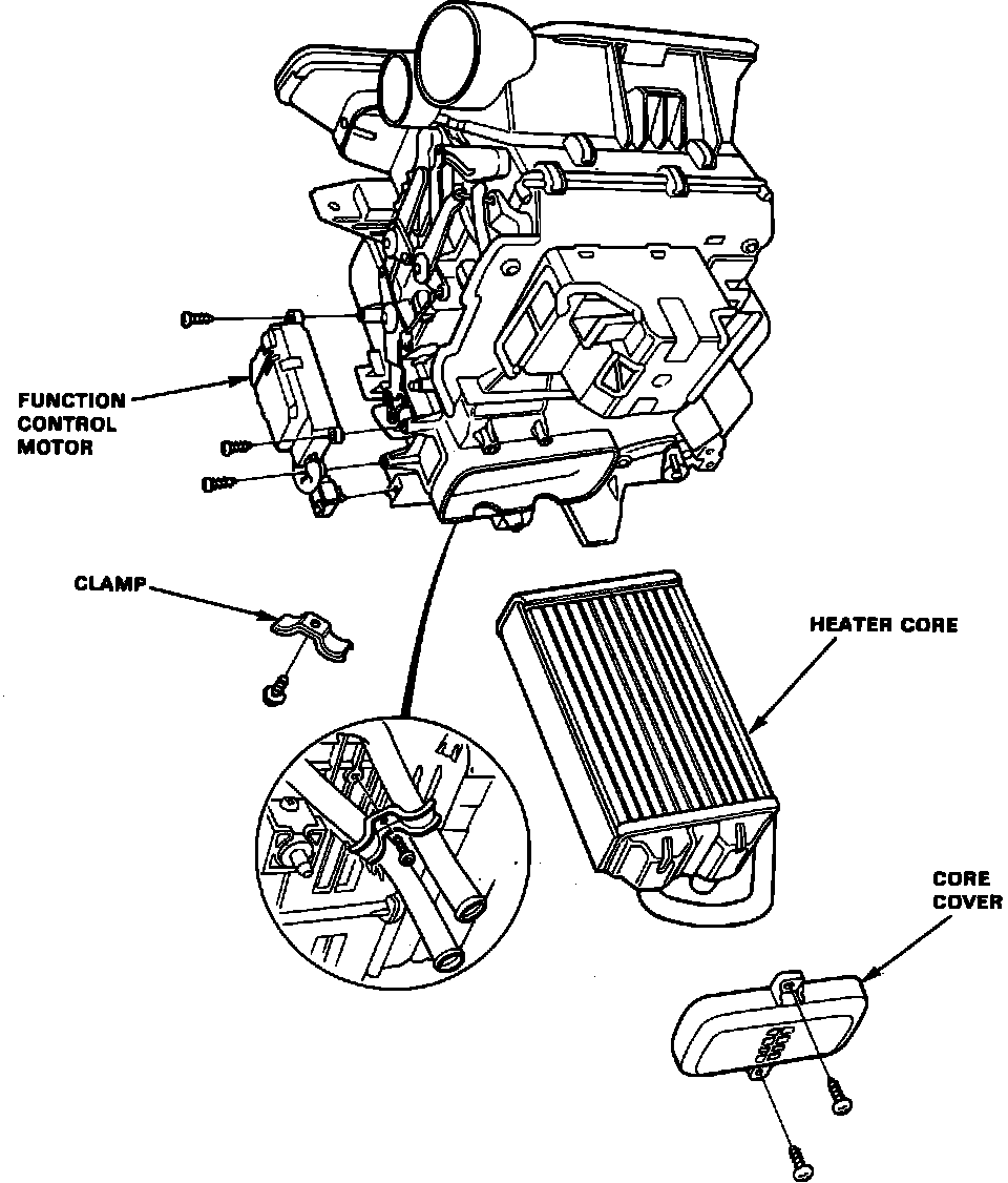 15. Remove heater core tube clamp, then remove heater core from heater housing.