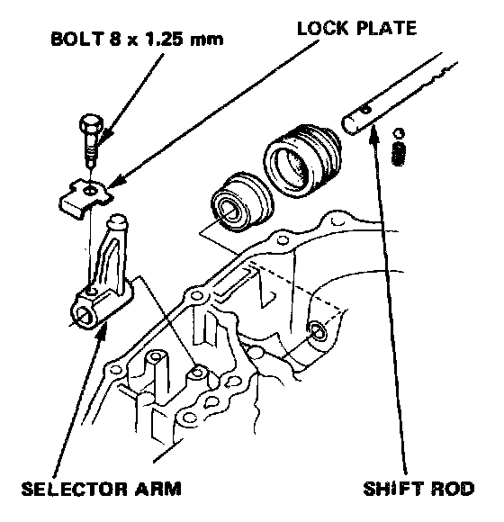 1. Install the shift rod, selector arm, new lock plate and bolt. Bend the lock tab on lock plate over against bolt head.