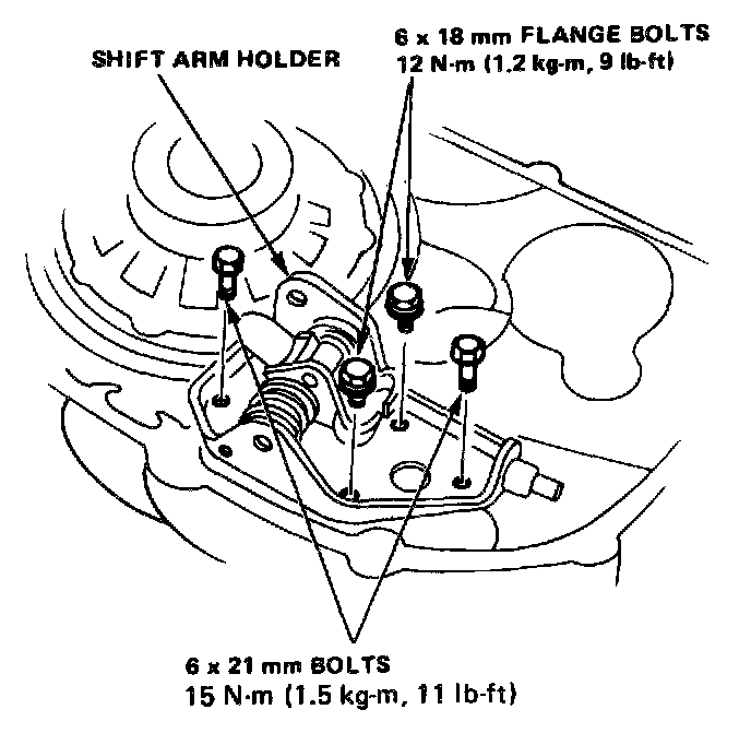 3. Align the shift arm with selector arm and install shift arm holder. Install the bolts, using the correct bolt in each hole, and torquing as shown.