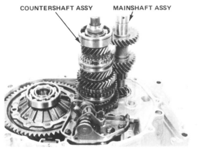 16. Install the transmission housing being careful to line up shafts. Expand countershaft bearings snap ring so that transmission housing can fall into place.