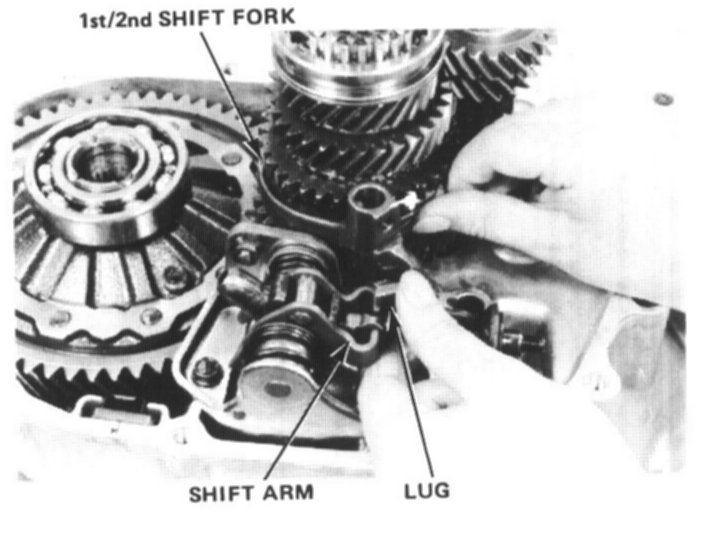 6. Install the 1st/2nd gear shift fork on synchronizer sleeve, then rotate into place so that lugs on back of fork fit over shift arm.