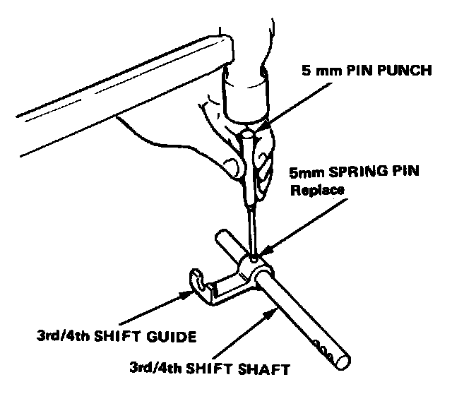 7. Insert the 3rd/4th shift fork shaft into 3rd/4th shift guide, and install the 5 mm spring pin as shown.