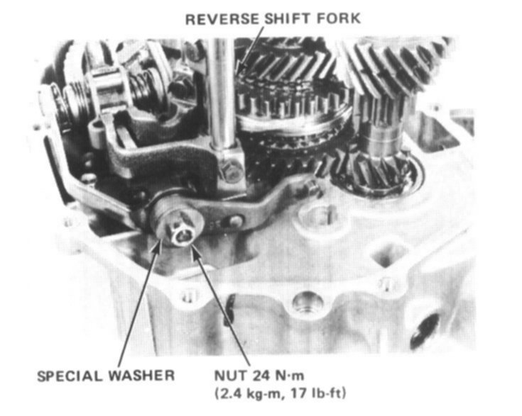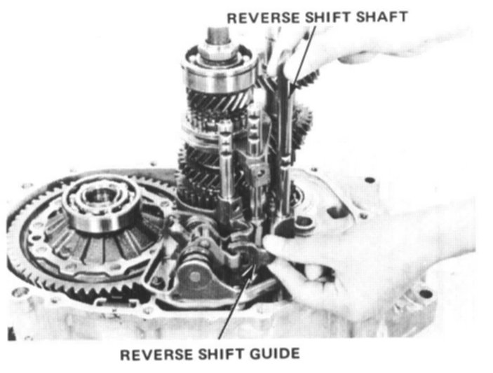 10. Hook the reverse shift guide to shift arm, then install the shift shaft.