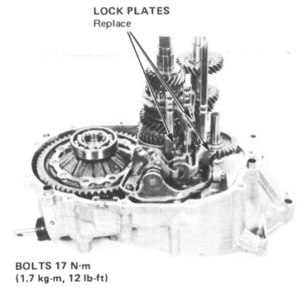 13. Install the three special bolts and lock plates on shift shafts then bend tab on each lock plate against bolt head.