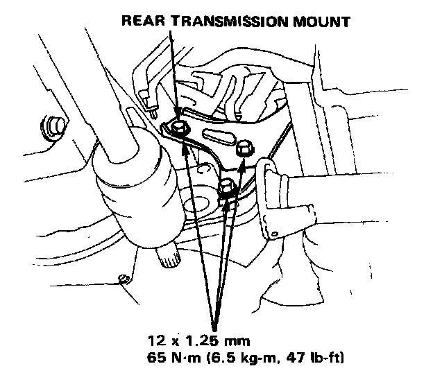 7. Install the rear transmission mount on the transmission housing. Torque its bolts to 65 N.m (6.5 kg-m, 47 lb-ft).